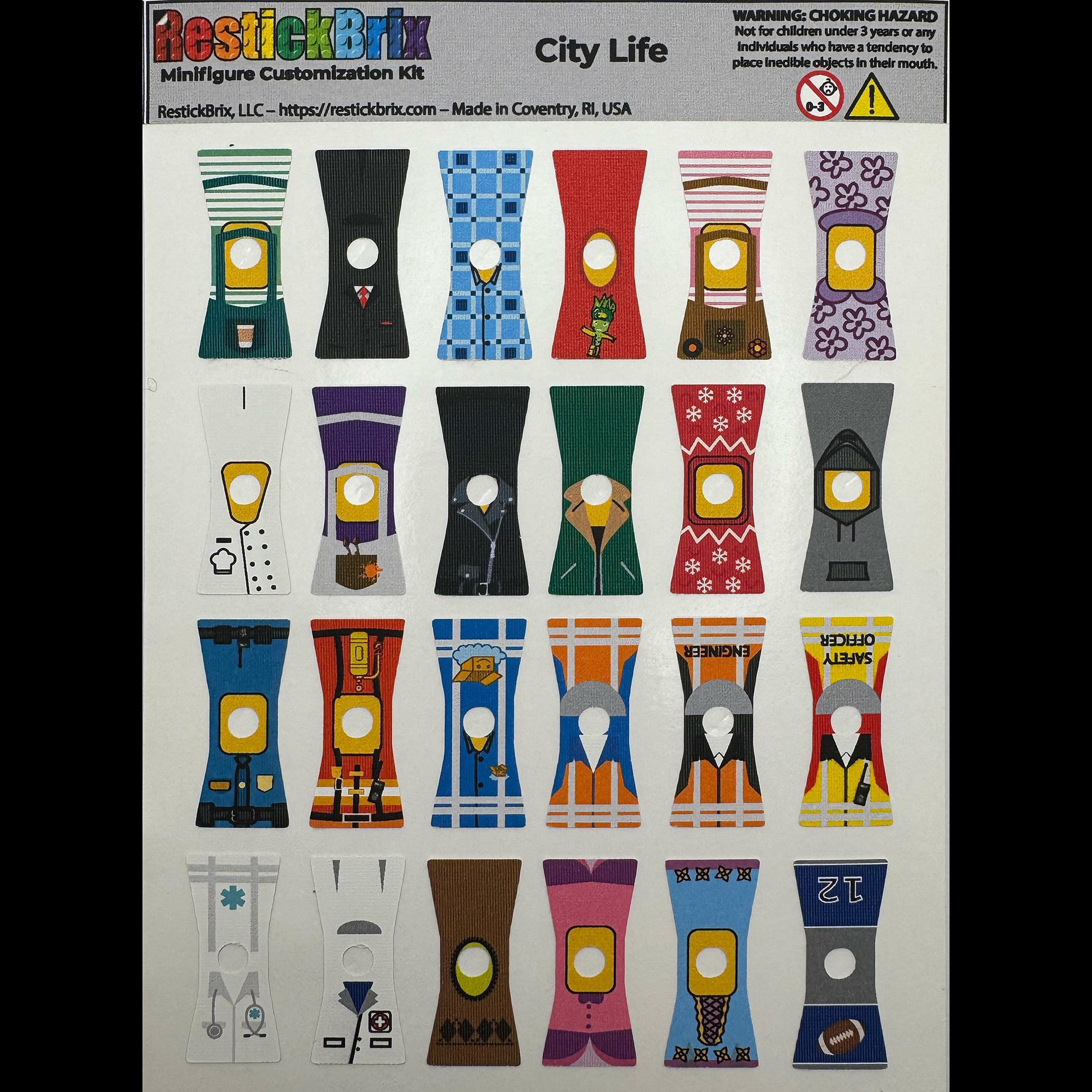 The City Life Minifigure Customization Kit includes 24 reusable adhesive fabric stickers featuring every day themed torsos, including different occupations, first responders, construction workers, and fashionable clothes.