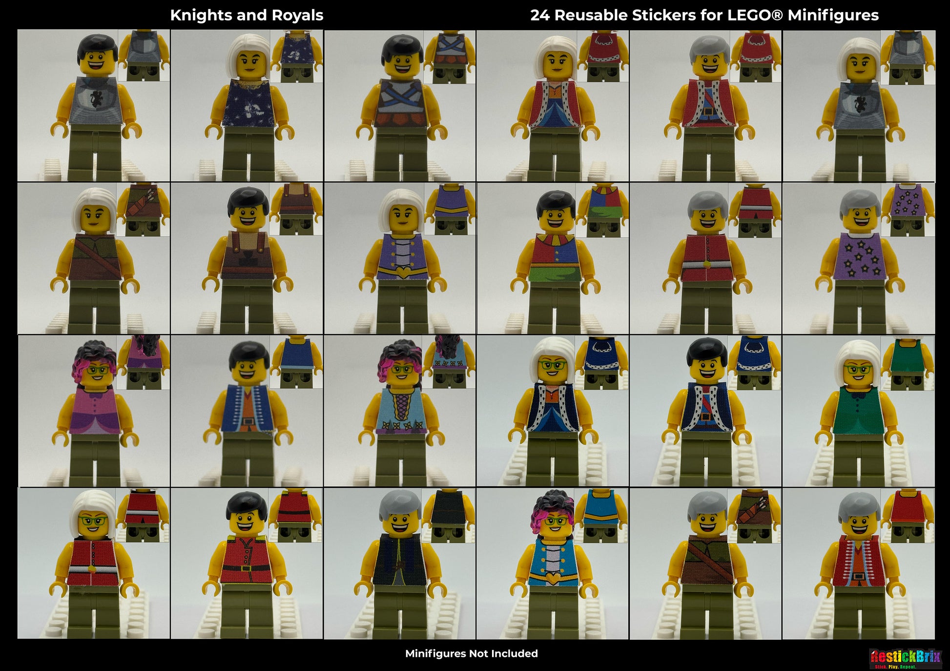 The Knights and Royals Minifigure Customization Kit includes 24 reusable adhesive fabric stickers featuring royal themed torsos, including kings, queens, princes, princesses, knights, and more.