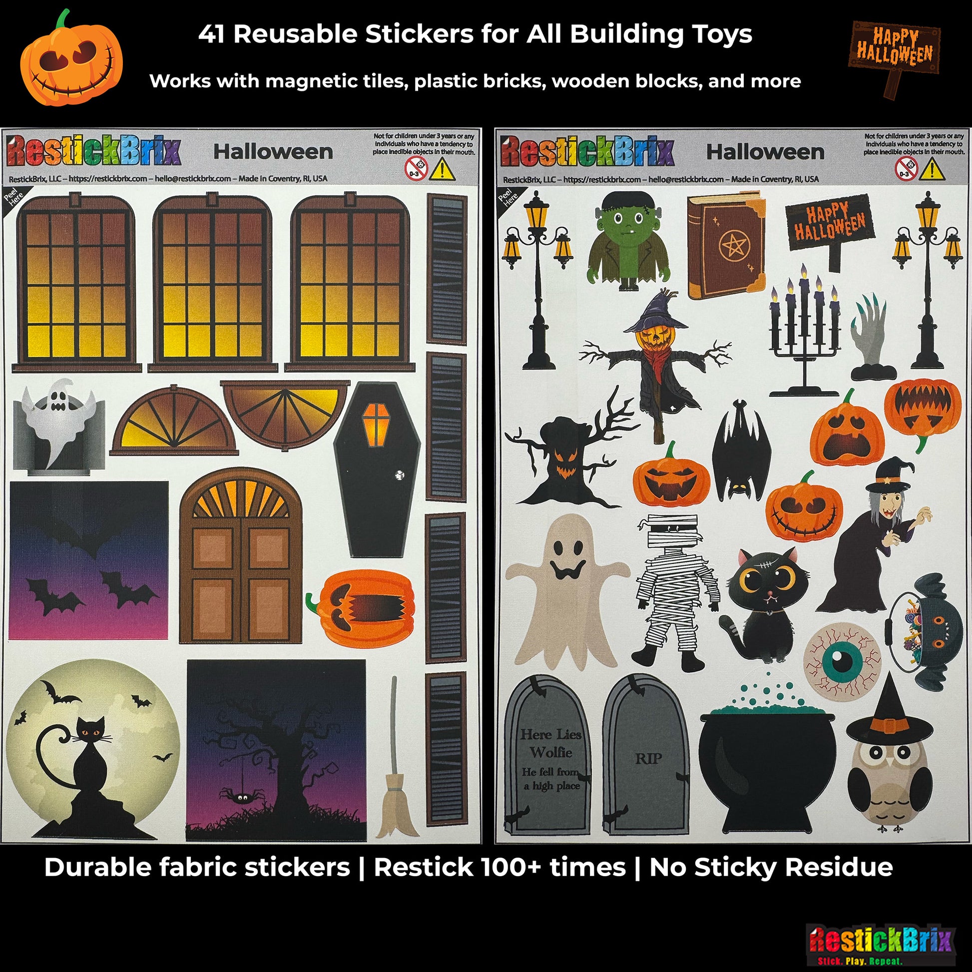 The Halloween Pack includes 41 reusable adhesive fabric stickers across 2 sheets, featuring a variety of spooky elements to customize their creations.
