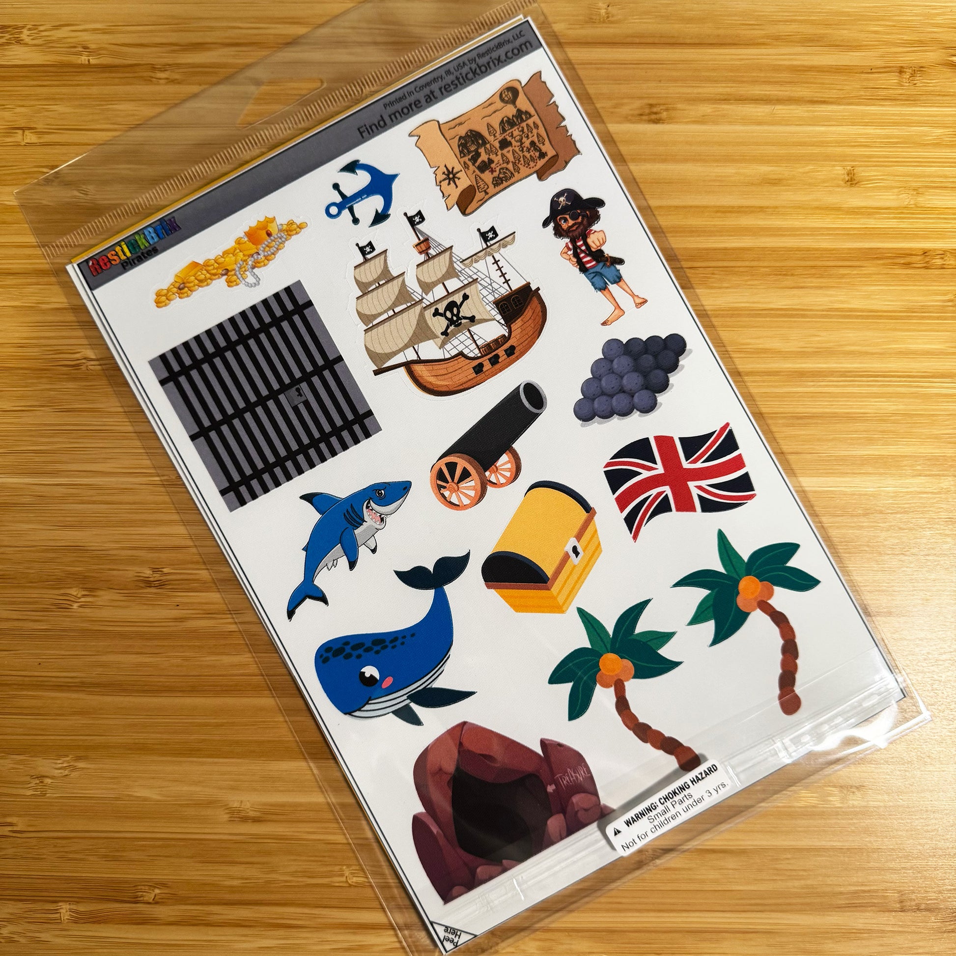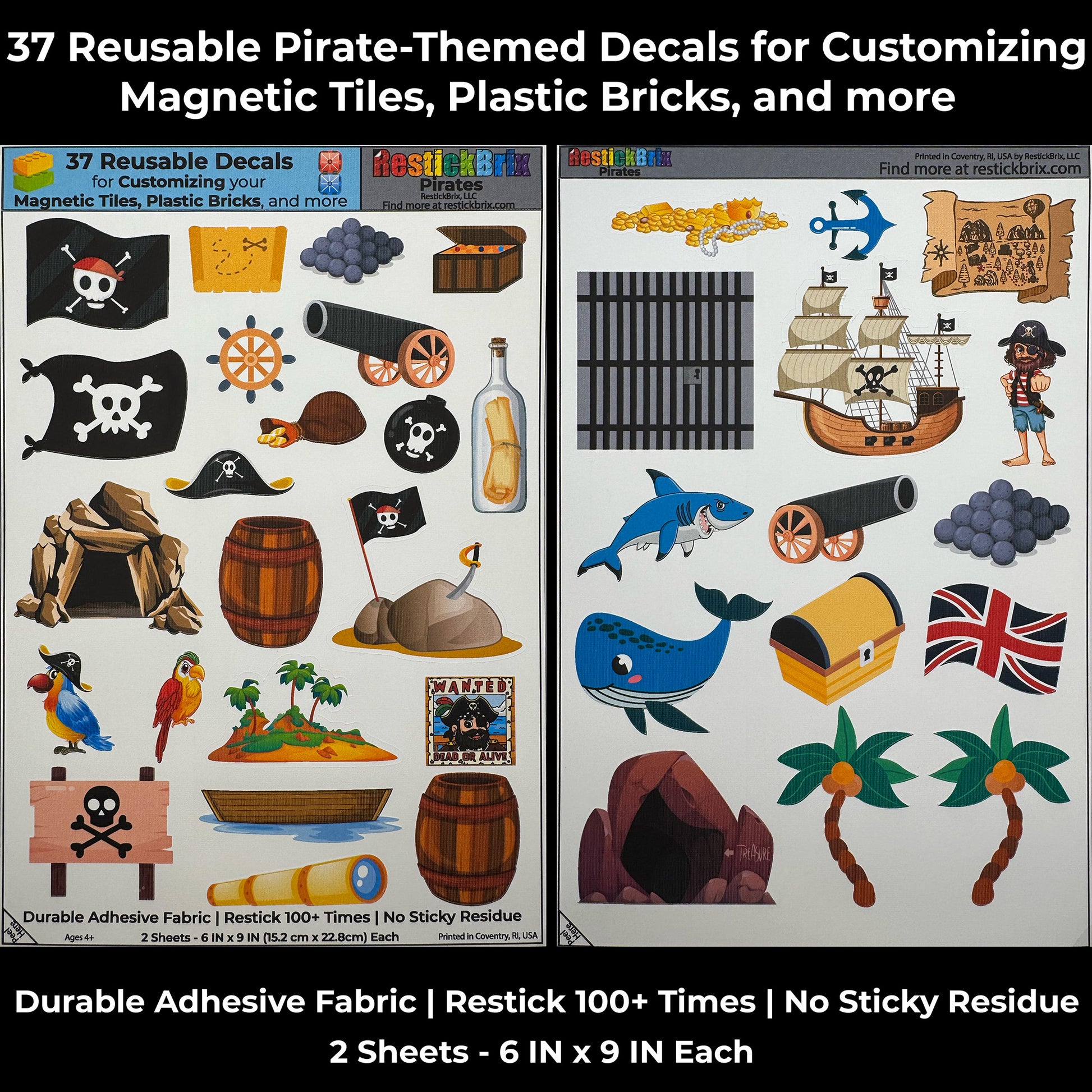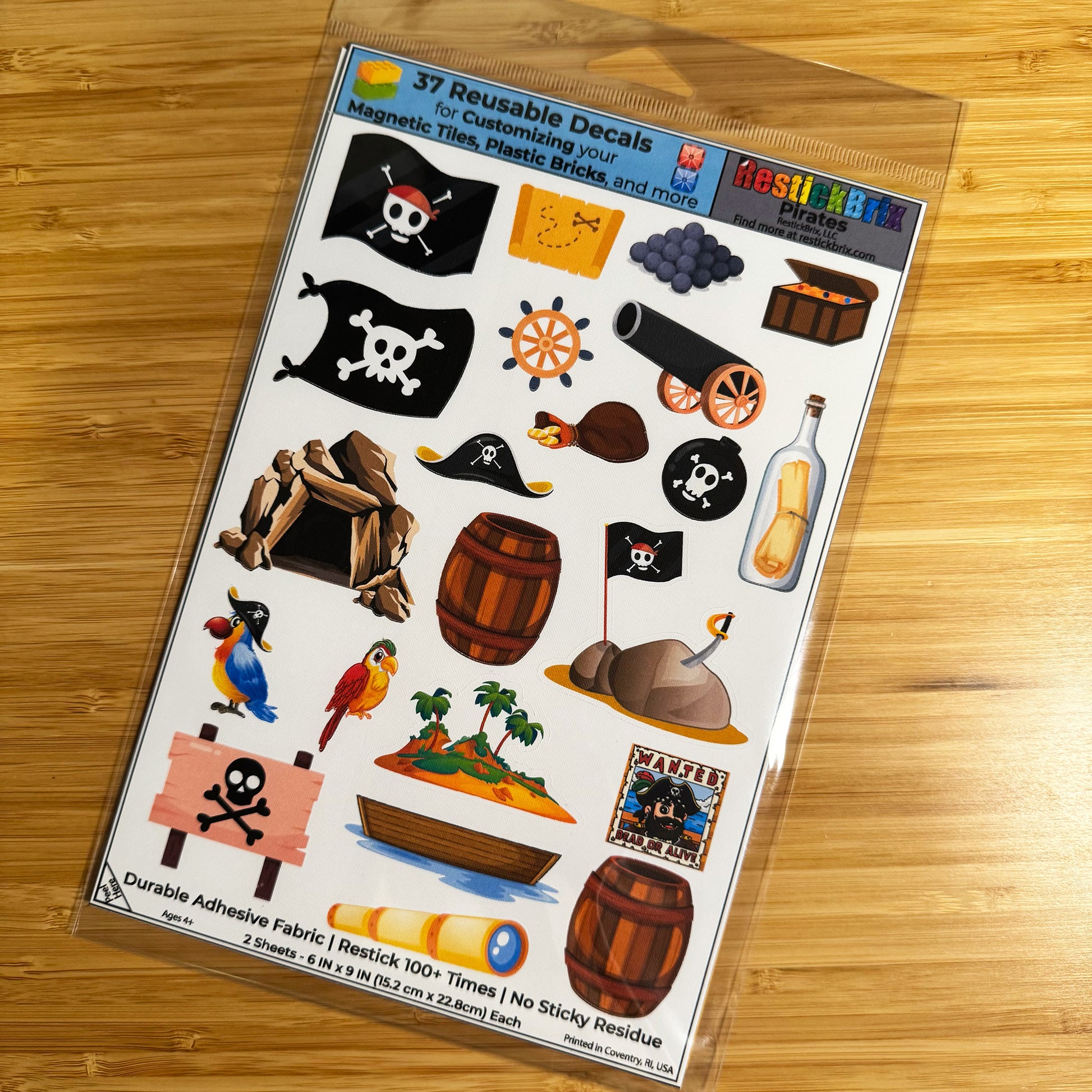 The Pirates Pack includes 37 stickers across 2 sheets, featuring flags, ships, treasure, islands, sea animals, and more.